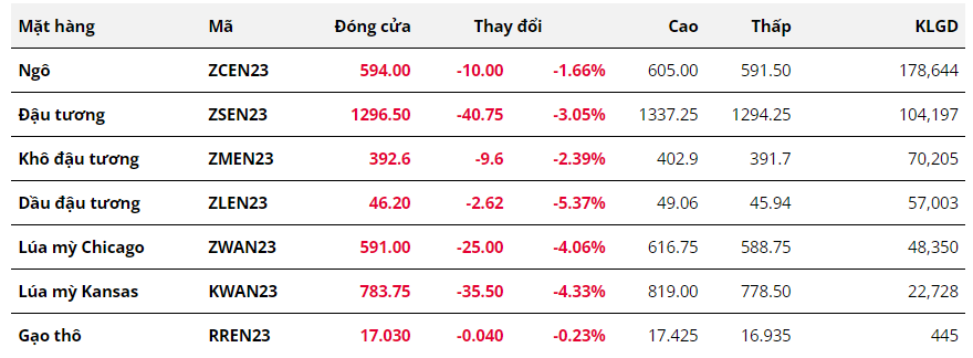 Giá lúa mì lao dốc khi bước vào phiên tối và đóng cửa với mức sụt giảm tới hơn 4%. Đây cũng là mức giảm mạnh nhất của giá mặt hàng này trong 6 tháng qua và khiến lúa mì hiện đang rẻ hơn so với ngô. Thời tiết tại Mỹ cải thiện cũng là nguyên nhân chính lý giải cho diễn biến giá.
