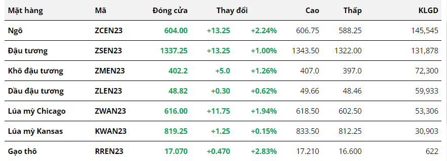 Trong khi đó, giá lúa mì cũng đóng cửa tăng gần 2% nhưng diễn biến chính vẫn thiên về xu hướng giằng co trên vùng 600. Lực mua lan toả trên toàn nhóm nông sản và nguy cơ thoả thuận ngũ cốc Biển Đen lại một lần nữa đứng trước nguy cơ kết thúc đã lý giải cho mức tăng mạnh trên.