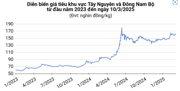 Giá tiêu hôm nay (10/3) tại thị trường trong nước ổn định ở mức 159.000 – 162.000 đồng/kg. Tại Ấn Độ, giá hồ tiêu đã tăng hơn 40% trong hai năm qua, và các chuyên gia cảnh báo giá có thể tiếp tục tăng do sản lượng giảm tại các khu vực trồng chính.