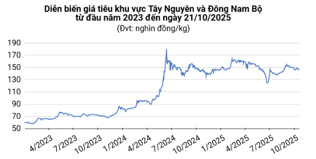 Theo ghi nhận, giá tiêu sáng nay tại các địa phương sản xuất trọng điểm dao động trong khoảng 144.000 – 146.000 đồng/kg, tăng 500 đồng/kg tại khu vực Đông Nam Bộ và giữ ổn định tại Tây Nguyên