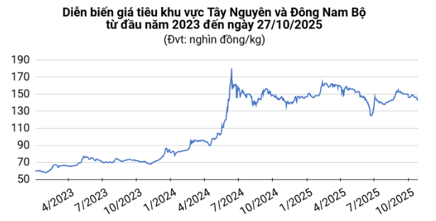Giá tiêu hôm nay tại thị trường trong nước vẫn duy trì ở mức 142.000 – 143.000 đồng/kg. Tính đến hết tháng 8, tổng nhập khẩu hồ tiêu của Đức đạt 20.695 tấn, tăng 10,9% so với cùng kỳ năm 2024; trong đó nhập khẩu chủ yếu từ Việt Nam đạt 12.607 tấn, chiếm 60,1% thị phần và tăng 7,1% so với cùng kỳ.