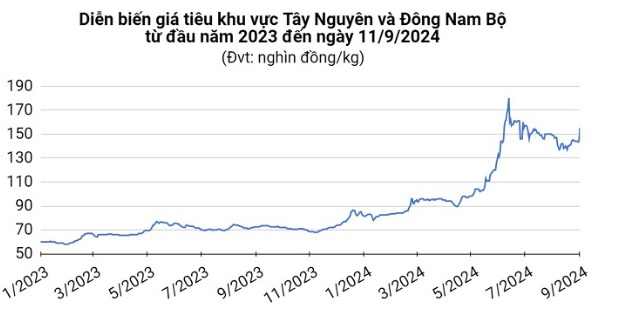 Giá tiêu cũng tăng 2.000 đồng/kg tại các tỉnh Đắk Nông, Đồng Nai và Bà Rịa - Vũng Tàu, lên mức 155.000 đồng/kg.