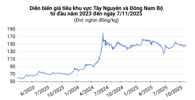 Giá tiêu hôm nay (7/11) tại thị trường trong nước tiếp tục đi ngang ở mốc 145.000 – 147.000 đồng/kg. Hồ tiêu Việt Nam đang trên đà lập kỷ lục mới khi kim ngạch xuất khẩu có thể vượt mốc 1,5 tỷ USD trong năm 2025. Trên thị trường thế giới, giá tiêu Indonesia tăng nhẹ trở lại.