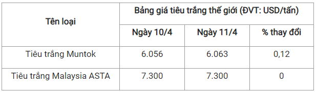 Theo cập nhật từ Hiệp hội Hồ tiêu Quốc tế (IPC) ngày 11/4 (theo giờ địa phương), giá tiêu thế giới so với ngày 10/4 như sau: