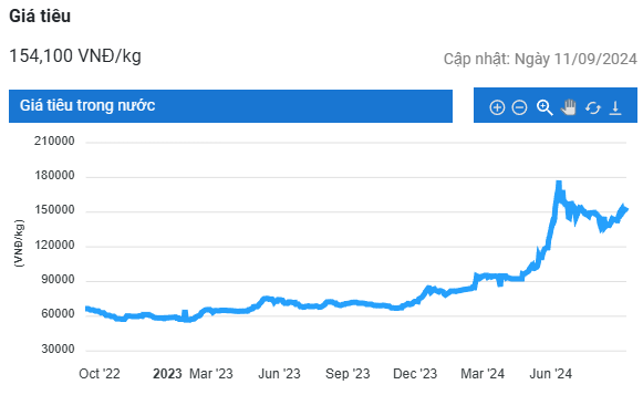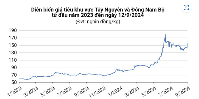 Tại tỉnh Bà Rịa - Vũng Tàu và tỉnh Đồng Nai, giá tiêu đi ngang ở mức 155.000 đồng/kg. Còn ở Bình Phước và Gia Lai, giá tiêu đạt lần lượt là 152.000 đồng/kg và 153.000 đồng/kg.