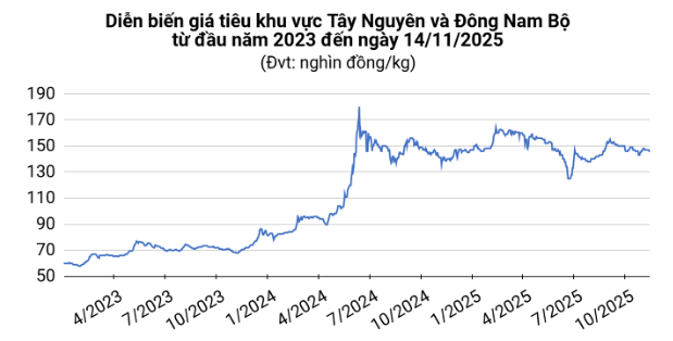Trong khi đó, tại Bình Phước (tỉnh Đồng Nai) và Bà Rịa – Vũng Tàu (TP. Hồ Chí Minh), giá tiêu đồng loạt giảm 1.000 đồng/kg, phổ biến ở mức 144.000 đồng/kg.