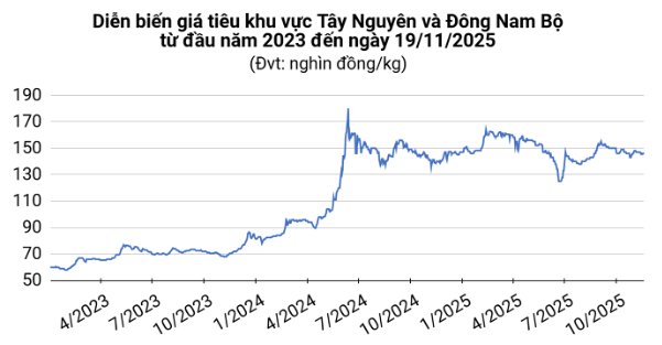 Giá tiêu hôm nay tại thị trường trong nước tiếp tục tăng thêm 500 đồng/kg, lên mức 145.000 – 146.500 đồng/kg. Ở chiều ngược lại, giá tiêu Indonesia đã quay đầu giảm trong phiên giao dịch gần nhất. Theo VPSA, tính đến giữa tháng 11, kim ngạch xuất khẩu hồ tiêu đã đạt 1,45 tỷ USD, vượt xa mức 1,3 tỷ USD của cả năm 2024.