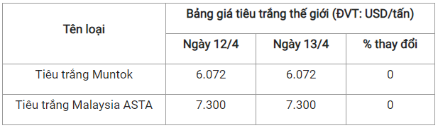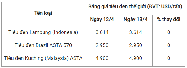 Theo cập nhật từ Hiệp hội Hồ tiêu Quốc tế (IPC) ngày 13/4 (theo giờ địa phương), giá tiêu thế giới so với ngày 12/4 như sau