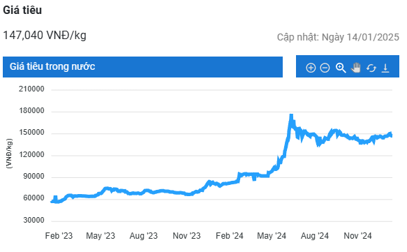 Cụ thể, giá tiêu tại hai tỉnh Đắk Lắk và Gia Lai điều chỉnh giảm 2.000 đồng/kg về mốc 145.000 đồng/kg.