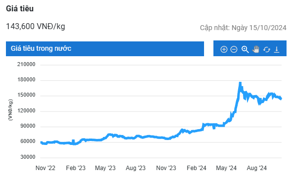 Giá tiêu hôm nay (16/10) dao động ở mức 143.500 – 144.000 đồng/kg, tăng nhẹ 500 đồng/kg tại khu vực Đông Nam Bộ và Gia Lai. Nhu cầu hồ tiêu từ thị trường Mỹ tăng cao, Việt Nam tiếp tục đứng đầu về thị trường cung cấp.