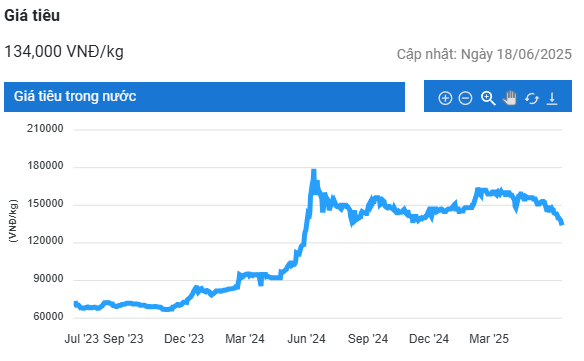 Giá tiêu hôm nay (18/6) tại thị trường trong nước tiếp tục giảm 1.500 – 2.000 đồng/kg, xuống dưới 135.000 đồng/kg. Trên thị trường thế giới, giá tiêu xuất khẩu của Việt Nam và Brazil cũng chứng kiến sự lao dốc trong phiên gần nhất.