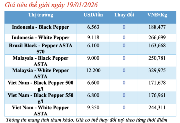 Cập nhật giá tiêu thế giới từ Hiệp hội Hồ tiêu Quốc tế (IPC) sáng 19/01/2026, hồ tiêu xuất khẩu hôm nay không ghi nhận biến động mới. Các thị trường duy trì ổn định so với phiên giao dịch hôm qua.