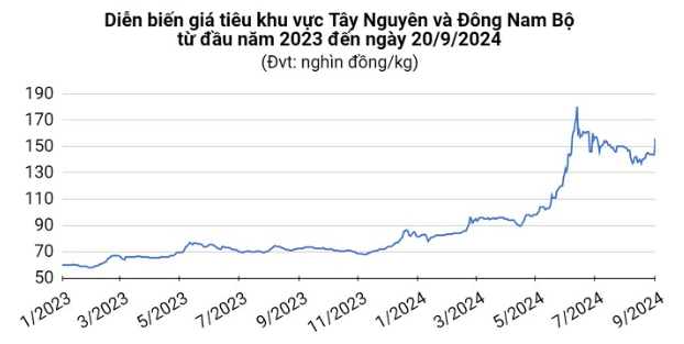 Giá tiêu hôm nay tại khu vực Tây Nguyên và Đông Nam Bộ tăng 500 – 2.000 đồng/kg, lên mức 148.500 – 151.000 đồng/kg.