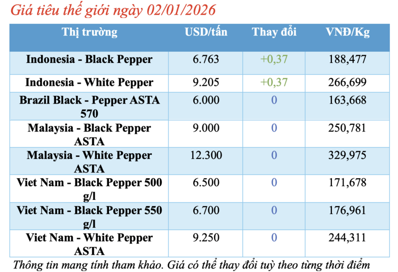 Cập nhật giá tiêu thế giới từ Hiệp hội Hồ tiêu Quốc tế (IPC) sáng 02/01/2026, hồ tiêu xuất khẩu hôm nay ghi nhận biến động tại thị trường Indonesia. Các thị trường khác đều ổn định giá so với phiên giao dịch hôm qua.