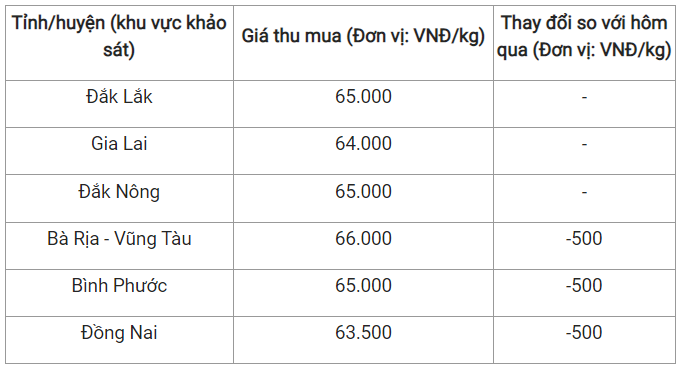 Trong đó, Gia Lai ghi nhận mức 64.000 đồng/kg, hai tỉnh Đắk Lắk và Đắk Nông cùng duy trì mức 65.000 đồng/kg.