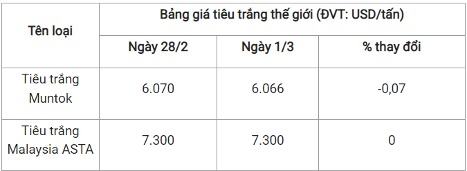 Theo cập nhật từ Hiệp hội Hồ tiêu Quốc tế (IPC) ngày 1/3 (theo giờ địa phương), giá tiêu thế giới so với ngày 28/2 như sau: