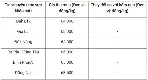 Ghi nhận cho thấy, Gia Lai đang là địa phương có mức giá thấp nhất là 63.000 đồng/kg. Tiếp theo đó là Đồng Nai với mức giá 63.500 đồng/kg.