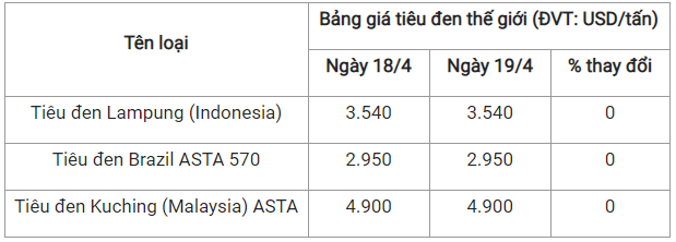 Theo cập nhật từ Hiệp hội Hồ tiêu Quốc tế (IPC) ngày 19/4 (theo giờ địa phương), giá tiêu thế giới so với ngày 18/4 như sau: