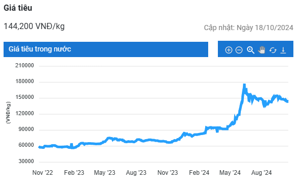 Giá tiêu hôm nay 21/10 ổn định ở mức 143.000 – 144.500 đồng/kg. Tính đến giữa tháng 10, xuất khẩu tiêu của Việt Nam đạt 209.933 tấn, kim ngạch thu về 1,05 tỷ USD, giảm 1,9% về lượng nhưng tăng tới 47% về kim ngạch so với cùng kỳ năm ngoái.