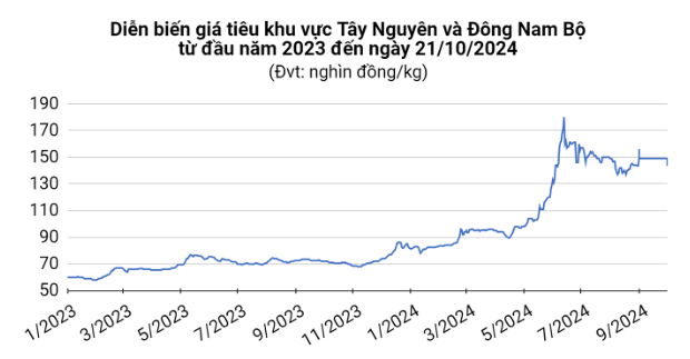 Tại Bình Phước và Gia Lai, giá tiêu đang được thu mua ở mức thấp nhất là 143.000 đồng/kg.