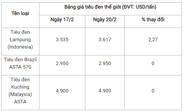 Theo cập nhật từ Hiệp hội Hồ tiêu Quốc tế (IPC) ngày 20/2 (theo giờ địa phương), giá tiêu thế giới so với ngày 17/2 như sau: