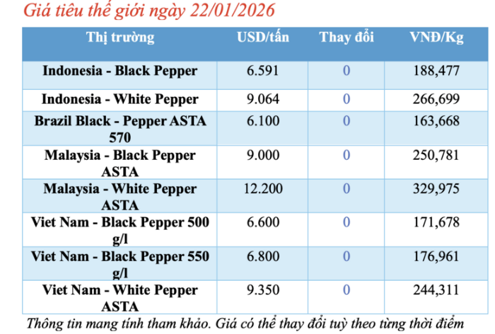 Cập nhật giá tiêu thế giới từ Hiệp hội Hồ tiêu Quốc tế (IPC) sáng 22/01/2026, hồ tiêu xuất khẩu hôm nay không ghi nhận biến động mới. Các thị trường đều duy trì mức giá ổn định so với phiên giao dịch hôm qua