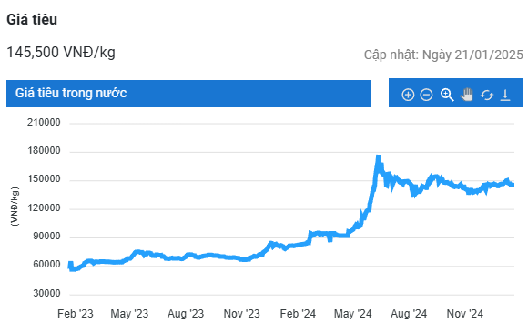 Giá tiêu hôm nay (22/1) tăng 1.500 – 2.000 đồng/kg ở hầu hết địa phương, cao nhất 147.500 đồng/kg. Trung Quốc được dự báo sẽ tăng mua ngay khi Việt Nam vào vụ thu hoạch chính vào tháng 3 – 4/2025, trong khi Mỹ có thể mua chậm hơn.