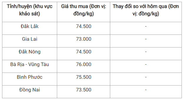 Cụ thể, hai tỉnh Gia Lai và Đồng Nai lần lượt ghi nhận mức giá là 73.000 đồng/kg và 73.500 đồng/kg.