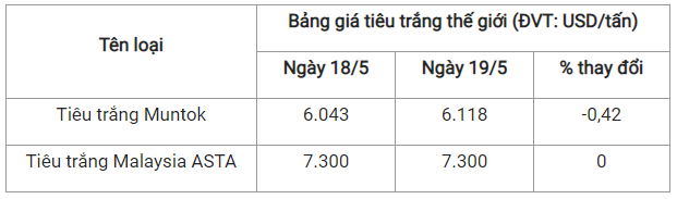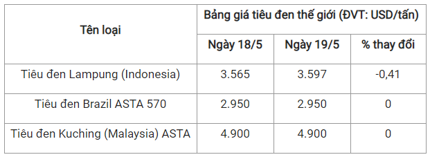 Theo cập nhật từ Hiệp hội Hồ tiêu Quốc tế (IPC) ngày 19/5 (theo giờ địa phương), giá tiêu thế giới so với ngày 18/5 như sau: