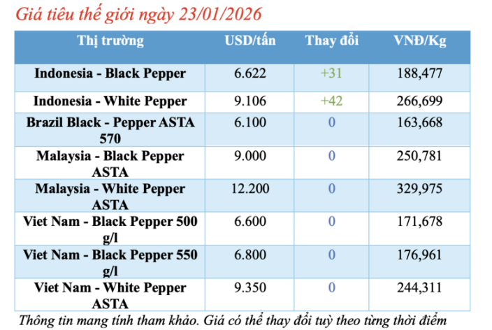 Cập nhật giá tiêu thế giới từ Hiệp hội Hồ tiêu Quốc tế (IPC) sáng 23/01/2026, hồ tiêu xuất khẩu hôm nay ghi nhận biến động mới từ thị trường Indonesia. Các thị trường khác đều duy trì mức giá ổn định so với phiên giao dịch hôm qua.