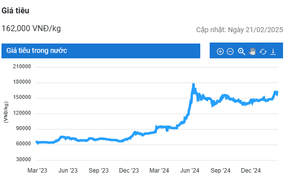 Theo ghi nhận, giá tiêu trong nước hôm nay giao dịch ở mức 160.000 - 162.000 đồng/kg, tăng 1.000 – 2.000 đồng/kg so với ngày hôm qua tùy từng địa phương.