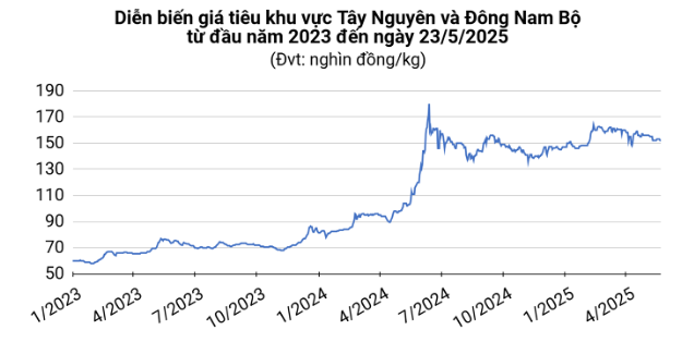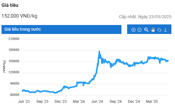 Giá tiêu hôm nay (23/5) tại thị trường trong nước đi ngang ở mức 150.000 – 152.000 đồng/kg. Trên thị trường thế giới, giá tiêu Indonesia điều chỉnh tăng 0,6%. Trong 10 thị trường xuất khẩu hạt tiêu lớn nhất của Việt Nam 4 tháng đầu năm 2025, Anh là thị trường có tốc độ tăng trưởng mạnh nhất.
