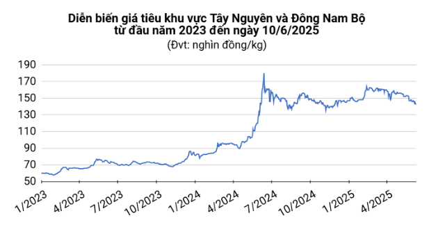 Cụ thể, giá tiêu tại hai tỉnh Đắk Lắk và Đắk Nông hiện được thu mua với giá cao nhất là 143.000 đồng/kg. Trong khi đó, tại các địa phương còn lại như Gia Lai, Bà Rịa – Vũng Tàu, Bình Phước và Đồng Nai, giá phổ biến ở mức 142.000 đồng/kg.
