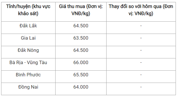 Hiện tại, mức giá thấp nhất được ghi nhận là 63.500 đồng/kg tại hai tỉnh Gia Lai. Nhỉnh hơn là Đồng Nai với mức giá 64.000 đồng/kg.