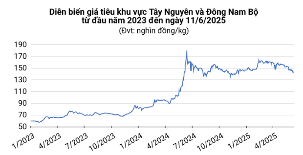 Tại tỉnh Đắk Lắk, giá tiêu cũng giảm 1.000 đồng/kg, xuống còn 142.000 đồng/kg.