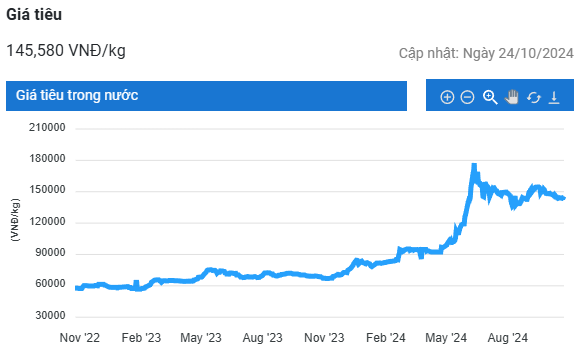 Giá tiêu hôm nay 25/10 tiếp tục tăng 500 – 1.000 đồng/kg tại các địa phương, lên mức 145.500 – 147.000 đồng/kg. Ghi nhận tại Bình Phước và Bà Rịa – Vũng Tàu, sản lượng tiêu có nguy cơ sụt giảm mạnh trong niên vụ tới.