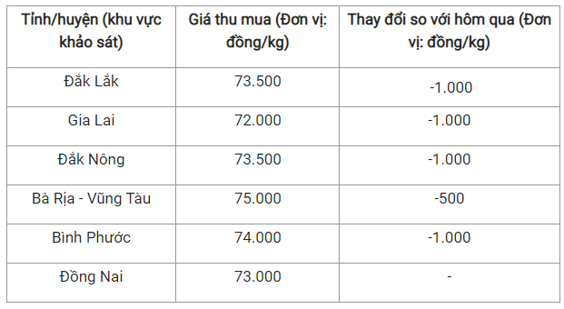 Sau khi cùng giảm 1.000 đồng/kg, hai tỉnh Đắk Lắk và Đắk Nông có chung giá thu mua là 73.500 đồng/kg.