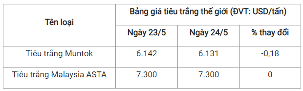 Theo cập nhật từ Hiệp hội Hồ tiêu Quốc tế (IPC) ngày 24/5 (theo giờ địa phương), giá tiêu thế giới so với ngày 23/5 như sau: