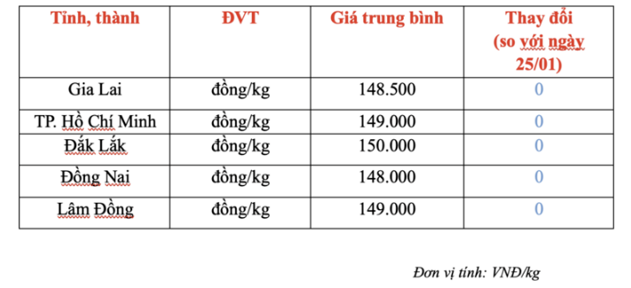 Trong khi đó, giá tiêu thị trường trong nước hôm nay (26/01) cũng không ghi nhận biến động mới. Hiện hồ tiêu trong nước duy trì ổn định quanh ngưỡng 148.000 - 150.000 đồng/kg