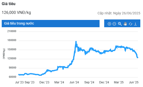 Giá tiêu hôm nay (26/6) tại thị trường trong nước tăng 1.000 – 2.000 đồng/kg, lên mức 124.000 – 126.000 đồng/kg. Trên thị trường thế giới, giá tiêu xuất khẩu của Indonesia cũng tiếp tục xu hướng tăng.