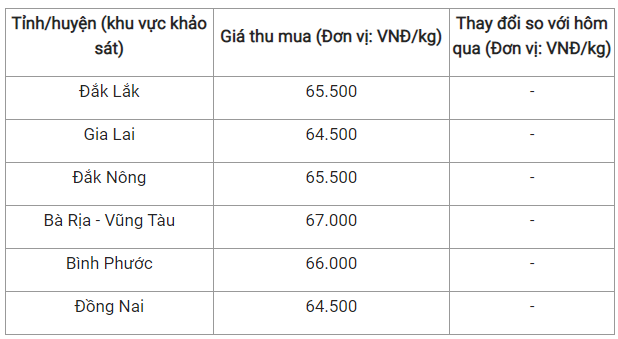 Hai tỉnh Đắk Lắk và Đắk Nông đang ghi nhận cùng mức giá 65.500 đồng/kg.