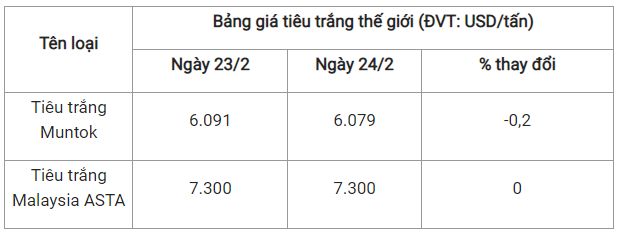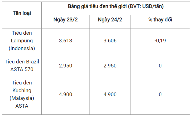 Theo cập nhật từ Hiệp hội Hồ tiêu Quốc tế (IPC) ngày 24/2 (theo giờ địa phương), giá tiêu thế giới so với ngày 23/2 như sau: