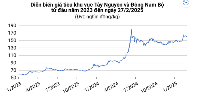 Giá tiêu hôm nay (27/2) tại thị trường trong nước dao động 157.000 – 159.000 đồng/kg, tiếp tục giảm 1.000 đồng/kg tại Đắk Lắk và Đắk Nông. Tuy nhiên, giá tiêu xuất khẩu của Việt Nam niêm yết trên thị trường thế giới lại tăng vọt 350 – 450 USD/tấn.