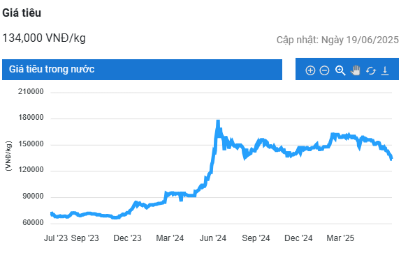 Giá tiêu hôm nay (19/6) dao động trong khoảng 132.500 – 134.000 đồng/kg, giảm 500 đồng/kg tại Gia Lai và ổn định tại các địa phương còn lại. Trong ngắn hạn, thị trường được cho là chịu nhiều sức ép nhưng dài hạn vẫn vững chắc.