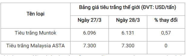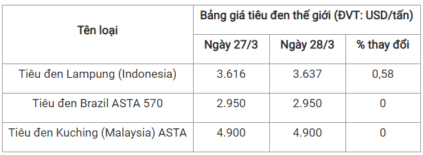 Theo cập nhật từ Hiệp hội Hồ tiêu Quốc tế (IPC) ngày 28/3 (theo giờ địa phương), giá tiêu thế giới so với ngày 27/3 như sau: