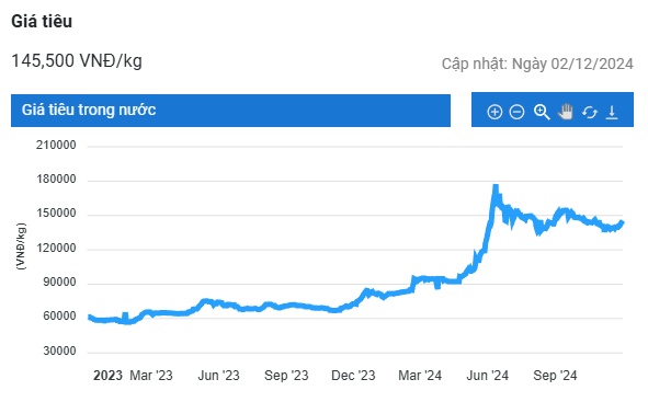 Giá tiêu hôm nay (3/12) dao động trong khoảng 144.000 – 147.000 đồng/kg, tăng nhẹ 500 đồng/kg tại Gia Lai. Hiện tại, tồn kho tiếp tục giảm mạnh khiến nguồn cung tiêu trên thị trường trở nên khan hiếm.