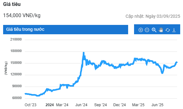 Giá tiêu hôm nay dao động trong khoảng 153.000 – 154.000 đồng/kg, tăng 1.000 đồng/kg so với ngày hôm trước. Tại Ấn Độ, sau khi giá hồ tiêu tăng mạnh, sự quan tâm của nông dân đối với cây trồng này đã tăng lên trong 3–4 năm qua.