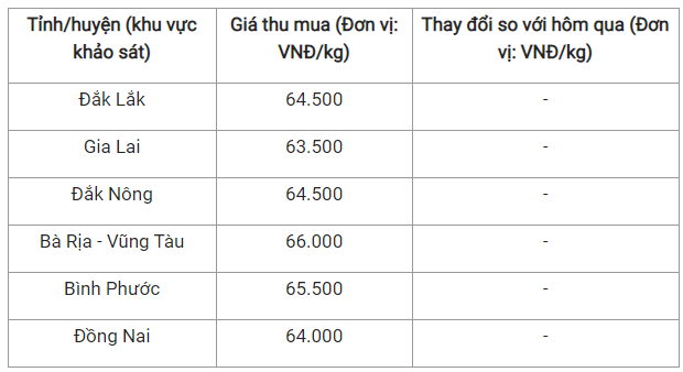 Hiện tại, mức giá thấp nhất là 63.500 đồng/kg được ghi nhận tại tỉnh Gia Lai, sau đó là Đồng Nai với mức 64.000 đồng/kg.