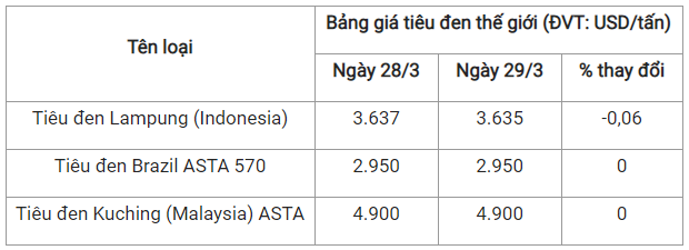 Theo cập nhật từ Hiệp hội Hồ tiêu Quốc tế (IPC) ngày 29/3 (theo giờ địa phương), giá tiêu thế giới so với ngày 28/3 như sau: