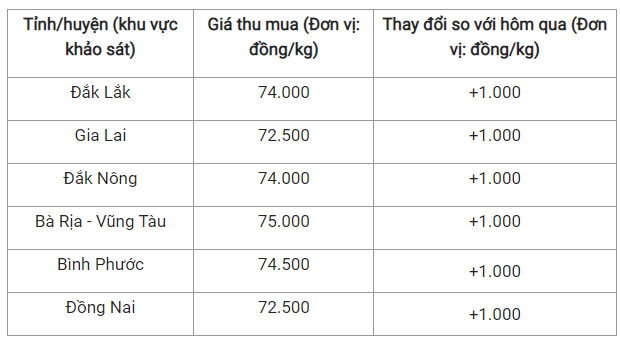 Hai tỉnh Đắk Lắk và Đắk Nông có cùng mức giá thu mua là 74.000 đồng/kg.